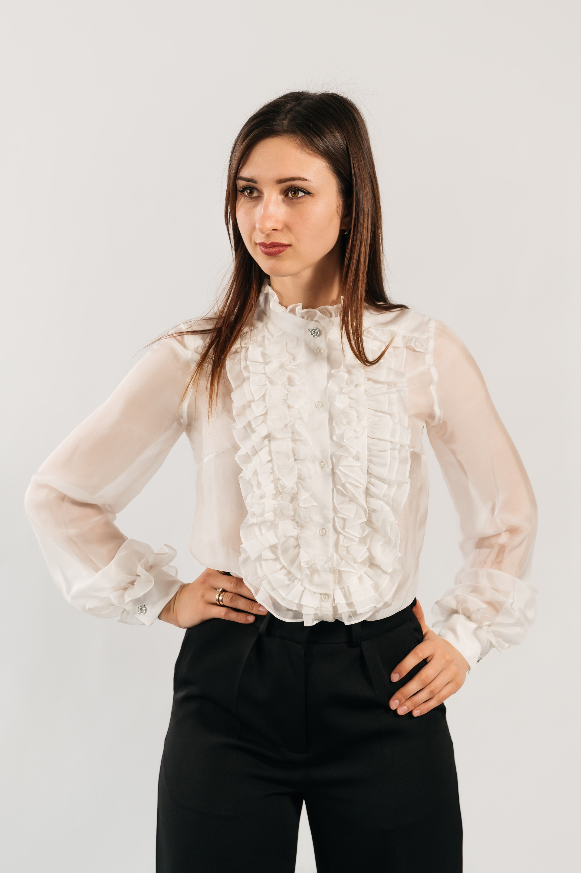 Bluză din mătase naturală, decorată în față cu 4 rânduri de volane. Maneci lungi cu manșete și volane, închidere pe nasturi.
